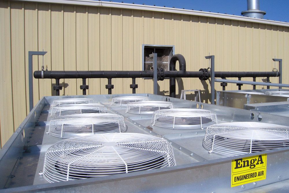 The AF Series condenser and fluid cooler is constructed of direct drive fans, whereas the DCU Series condenser and fluid cooler is built using belt driven fans. Both units are manufactured using heavy gauge galvanized metal selected for long life in outdoor environments.